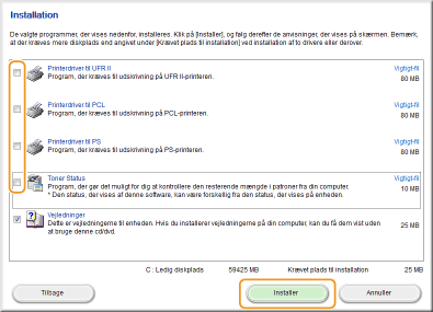 Fjern markeringen i alle afkrydsningsfelterne med undtagelse af [Manuals] (Manualer), og klik på [Install] (Installer).