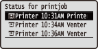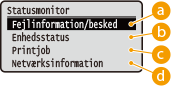, vises en skærm, der giver dig mulighed for at kontrollere statussen for det dokument, der udskrives, samt statussen for maskinen (resterende mængde i tonerpatronen, etc.) eller oplysninger om netværksindstillinger som f.eks. maskinens IP-adresse.