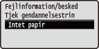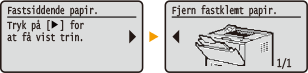 Når der opstår en fejl, vil der i visse tilfælde blive vist instruktioner i, hvordan der skal reageres på fejlen. Følg anvisningerne på skærmen for at løse problemet. Den skærm, der vises, når der opstår et papirstop, er vist som eksempel herunder.