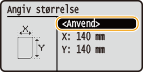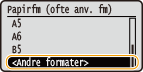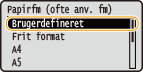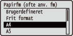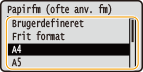 Hvis den skærm, der er angivet herover, ikke vises, når der er ilagt papirHvis du altid ilægger det samme papir i universalbakken, kan du springe betjeningen af papirindstillingerne over ved at registrere papirformatet og papirtypen som standardindstillingen. Når standardindstillingen er blevet registreret, vil den skærm, der er angivet herover, imidlertid ikke blive vist. Hvis du vil vise skærmen, skal du vælge <Angiv ved ilægning af papir> (Registrering af standardpapirindstillinger for universalbakken).