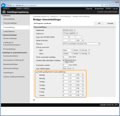 Marker afkrydsningsfeltet [Indstil ugentlig timer for auto-nedlukning], og indstil tidspunktet, hvor der skal slukkes for strømmen.