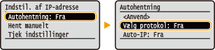 og indstille både <Vælg protokol> og <Auto-IP> til <Fra>. |