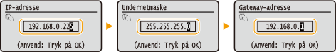 <Undernetmaske> <Gateway-adresse>.Angiv hver enkelt indstilling ved hjælp af taltasterne, og tryk på