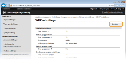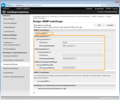 SNMP (Simple Network Management Protocol) er en protokol til overvågning og styring af kommunikationsenheder på et netværk ved hjælp af MIB (Management Information Base). Maskinen understøtter SNMPv1 og den sikkerhedsudvidede SNMPv3-udgave. Du kan kontrollere statussen på maskinen fra en computer, når du udskriver dokumenter eller bruger Brugerinterface til fjernbetjening. Du kan aktivere enten SNMPv1 eller SNMPv3 eller begge på samme tid. Angiv indstillingerne for hver version, så de passer til dit netværksmiljø og anvendelsens formål.
