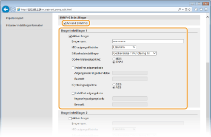 Hvis begge SNMP-versioner er aktiveret, anbefales det, at MIB-adgangstilladelse i SNMPv1 angives til [Skrivebeskyttet]. MIB-adgangstilladelsen kan indstilles uafhængigt i SNMPv1 og SNMPv3 (og for hver bruger i SNMPv3). Hvis [Læs/skriv] (fuld adgangstilladelse) vælges i SNMPv1, negerer det de robuste sikkerhedsfunktioner, der er et kendetegn ved SNMPv3, fordi de fleste af maskinindstillingerne så kan kontrolleres med SNMPv1.