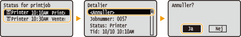 Annullering fra Fjern-UIDu kan annullere udskrivning via siden [Jobstatus] på Fjern-UI: Kontrol af den aktuelle status for dokumenter til udskrivning