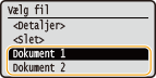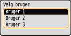 Hvis sikrede dokumenter fra to eller flere brugere holdes i hukommelsen, vises skærmen <Vælg bruger> før skærmen <Vælg fil>. Vælg dit brugernavn og tryk på