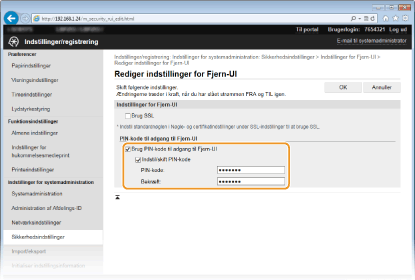 Marker afkrydsningsfeltet [Brug PIN-kode til adgang til Fjern-UI], og angiv pinkoden.