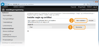 Klik på [Nøgle- og certifikatindstillinger] for at installere et nøglepar eller [CA-certifikatindstillinger] for at installere et CA-certifikat.