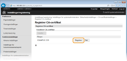 Klik på [Registrer] til højre for det CA-certifikat, du vil registrere.
