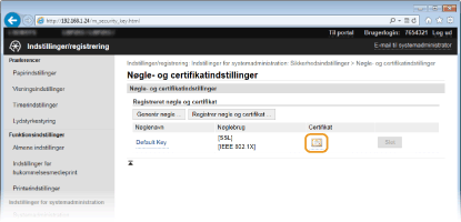 Klik på [Nøgle- og certifikatindstillinger] for at bekræfte et nøglepar eller [CA-certifikatindstillinger] for at bekræfte et CA-certifikat.
