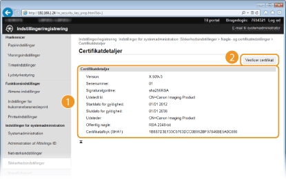 Kontroller certifikatets detaljer, og klik på [Verificer certifikat].