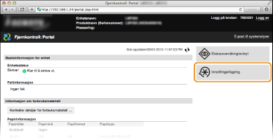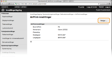 Du kan registrere informasjon, inkludert navnet på maskinen og installasjonsstedet, som brukes for å identifisere maskinen. Du kan også deaktivere AirPrint-funksjonen til maskinen. Bruk Fjernkontroll til å endre disse innstillingene.