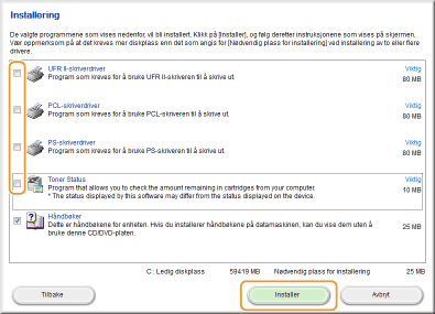 Fjern merket i alle avmerkingsbokser bortsett fra [Manuals] (Håndbøker), og klikk på [Install] (Installer).