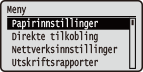 vises <Meny>-skjermbildet. I dette skjermbildet kan du starte spesifisering av generelle maskininnstillinger som <Preferanser> eller <Tidsinnstillinger>, samt mange av papirinnstillinger og tetthetsjustering.