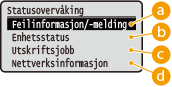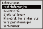 Viser statusen til maskinen, som for eksempel mengde papir eller hvor mye toner som er igjen i tonerkassetten.