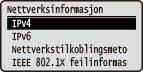 Viser nettverksinnstillingene, for eksempel maskinens IP-adresse, og status, for eksempel tilstanden til trådløs LAN-kommunikasjon.