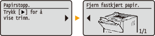 I noen tilfeller når en feil oppstår, vises anvisninger om hvordan du håndterer feilen. Følg anvisningene på skjermen for å løse problemet. Skjermen som vises når en papirstopp skjer vises under som et eksempel.