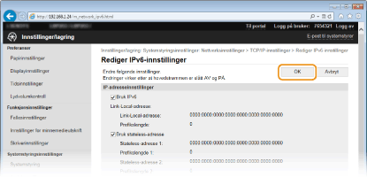 på betjeningspanelet. IPv6-innstillingerHvis du har endret IP adressen etter at du installerte skriverdriverenDu må legge til en ny port. Konfigurere skriverporter