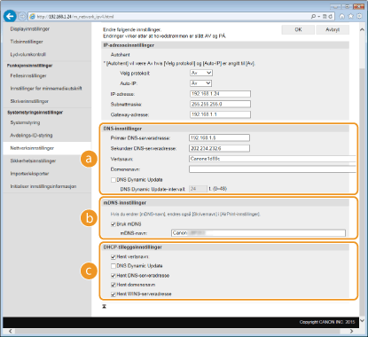 mDNS (multikast-DNS) brukes av Bonjour og er en protokoll for å knytte et vertsnavn til en IP-adresse uten bruk av DNS. Merk av i boksen hvis du vil aktivere mDNS, og angi mDNS-navnet i tekstboksen [mDNS-navn]. [DHCP-tilleggsinnstillinger][Hent vertsnavn]