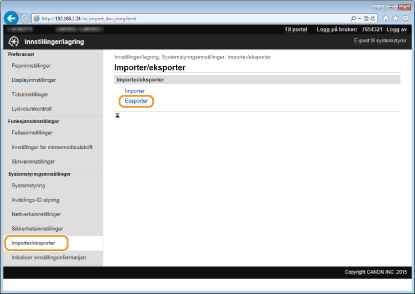 Du kan eksportere maskininnstillingsdata og lagre dem på en datamaskin. Det anbefales at du regelmessig sikkerhetskopierer viktige innstillinger.