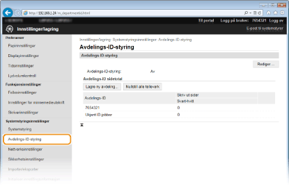 [Avdelings-ID sidetotal]Du kan kontrollere det totale antallet utskrevne sider for hver avdelings-ID.