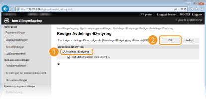 Merk av for [Bruk Administrasjon av avdelings-ID], og klikk på [Innstillinger] til høyre.