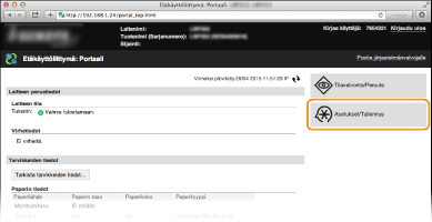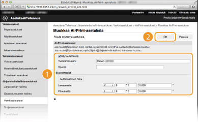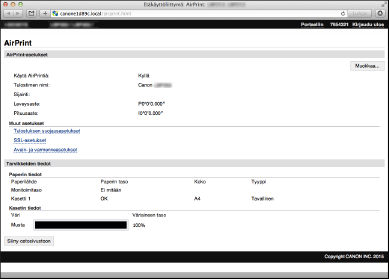 Voit tallentaa tiedot, joita käytetään laitteen tunnistamiseen, mm. laitteen nimen ja asennuspaikan. Voit myös poistaa laitteen AirPrint-toiminnon käytöstä. Käytä etäkäyttöliittymää näiden asetusten muuttamiseen.