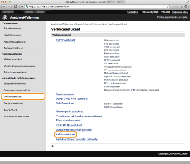 Kirjaudu sisään järjestelmänvalvojan tilassa AirPrint-asetusten muuttamista varten.