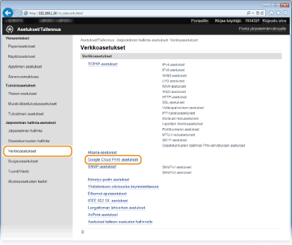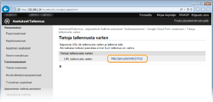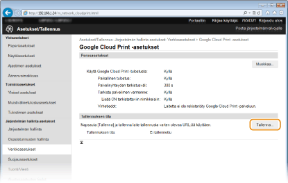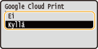 Ota käyttöön laitteen Google Cloud Print -toiminto. Voit myös poistaa käytöstä laitteen Google Cloud Print -toiminnon.