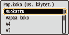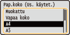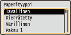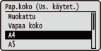 Jos yllä olevaa näyttöä ei näytetä, kun paperia lisätäänJos monikäyttöalustalle lisätään aina samaa paperia, voit ohittaa paperiasetustoiminnot tallentamalla paperikoon ja -tyypin oletusasetukseksi. Kun oletusasetus on tallennettu, yllä olevaa näyttöä ei näytetä. Voit tuoda näytön esiin valitsemalla <Määritä paperin lataaminen> (Monikäyttötason oletuspaperiasetuksien tallentaminen).