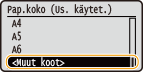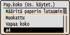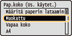 Kun oletuspaperiasetus on tallennettu, paperiasetusnäyttöä ei näytetä, kun paperia lisätään, ja samaa asetusta käytetään aina. Jos lisäät erilaista paperikokoa tai -tyyppiä vaihtamatta paperiasetuksia, laite ei ehkä tulosta oikein. Voit välttää tämän ongelman valitsemalla <Määritä paperin lataaminen> vaiheessa 3 ja lisäämällä sitten paperin.