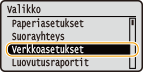 Kaikki verkkoasetukset ja lyhyet kuvaukset luetellaan. Oletusasetukset on merkitty tikarilla (