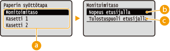 Paperi), paperilähteelle käytetään asetusta <Nopeus etusijalla> sen sijasta. Tässä tapauksessa sinun on lisättävä paperit samalla tavalla kuin valittaessa <Nopeus etusijalla> (
