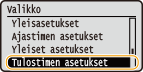 ![]() Käytettävissä olevat asetuksetKaikki tässä osassa kuvatut tulostusasetukset, paitsi <Paperikoon ohitus> (Paperikoon ohitus), ovat käytettävissä vain PS/PCL-tulostuksessa. Näitä asetuksia ei tarvitse määrittää, jos esimerkiksi tulostetaan käyttäen UFR II -tulostinajuria.