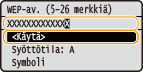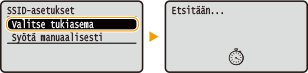SuojausasetuksetJos langaton yhteys asetetaan valitsemalla langaton reititin, WEP-todennustavaksi asetetaan <Avoin järjestelmä> tai WPA/WPA2-salaustavaksi asetetaan <Automaattinen> (AES-CCMP tai TKIP). Jos haluat valita WEP-todennustavaksi <Jaettu avain> tai WPA/WPA2-salaustavaksi <AES-CCMP>, yhteys on asettava käyttäen manuaalista tietojen syöttöä (Yhteyden asettaminen määrittämällä tarkat tiedot).