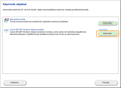 SSID tai verkkoavain on saatettu muuttaa. Jos et tiedä SSID:tä tai verkkoavainta, voit tarkistaa ne käyttämällä DVD-ROM -levyllä olevaa Canon MF/LBP Wireless Setup Assistant -ohjelmaa. Canon MF/LBP Wireless Setup Assistant -ohjelmaa voi käyttää tietokoneessa, joka on yhdistetty langattomaan lähiverkkoon.