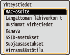 Voit tarvittaessa tulostaa nykyisten verkkoasetusten luettelon. Käyttäjän tietolista/Järjestelmänvalvojan tietolista