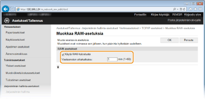 Valitse RAW-tulostuksen valintaruutu. Kun ei käytetä RAW-tulostusta, poista valintaruudun valinta. [Vastaanoton aikakatkaisu]