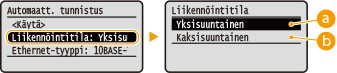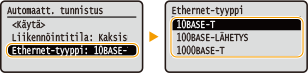 Valitse Ethernet-tyyppi ![]() ![]() ![]() Kun <Liikennöintitila>-asetukseksi on valittu <Yksisuuntainen>, vaihtoehtoa <1000BASE-T> ei voi valita.