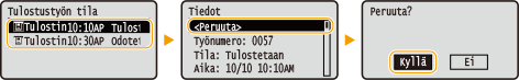 Peruuttaminen etäkäyttöliittymästäVoit peruuttaa tulostuksen etäkäyttöliittymän [Työn tila] -sivulta: Tulostusasiakirjojen nykyisen tilan tarkistaminen