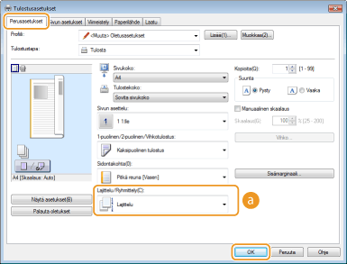 Kun tulostat monisivuisia asiakirjoja, valitse [Lajittelu], kun haluat tulostaa täydellisiä sarjoja sivujärjestyksessä. Tämä toiminto on kätevä esimerkiksi valmisteltaessa kokouksessa tai esityksessä jaettavaa materiaalia.