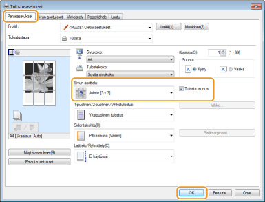 Julisteen kokoasetuksia ei voi valita, kun 2-puolinen tulostus on käytössä. Valitse [Yksipuolinen tulostus] kohdassa [1-puolinen/2-puolinen/Vihkotulostus] ja valitse sitten julisteen kokoasetus.