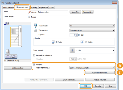 Valitse [Vesileima]-valintaruutu, joka avaa vesileimaluettelon kohdassa [Vesileiman nimi]. Valitse vesileima valikosta.