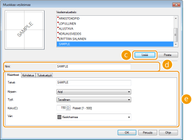 Valitse kukin välilehti ja määritä vesileiman teksti, väri ja tulostuskohta. Lisätietoja saat valitsemalla tulostinajurinäytön kohdan [Ohje].