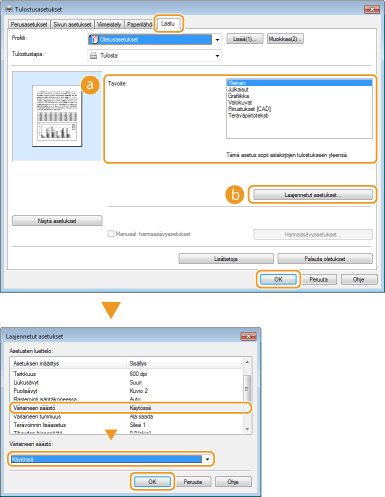[Laajennetut asetukset] -näytössä voit määrittää erilaisia tulostusasetuksia väriaineen säästön lisäksi. Lisätietoja saat valitsemalla tulostinajurinäytön kohdan [Ohje].