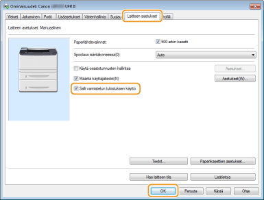 Napsauta [Laitteen asetukset] -välilehteä ja varmista, että [Salli varmistetun tulostuksen käyttö] -valintaruutu on valittu.