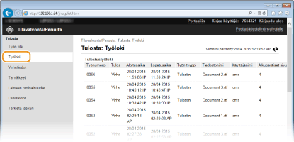 Valitse pysäytetyn asiakirjan tai turvatulostusasiakirjan [Työnumero], jos haluat nähdä tarkat tiedot. Voit tarkistaa tulostetun asiakirjan käyttäjänimen ja sivumäärän.