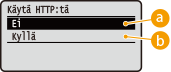HTTP:tä käytetään tiedonsiirtoon verkon kautta, esimerkiksi silloin, kun laitetta käytetään Etäkäyttöliittymällä. Jos käytät USB-yhteyttä tai et muuten käytä HTTP:tä, voit poistaa HTTP:n käytöstä ja näin estää kolmannen osapuolen hyökkäykset käyttämättömän HTTP-portin kautta.