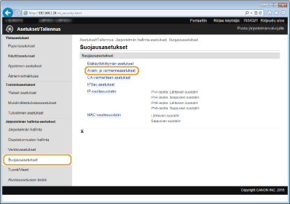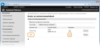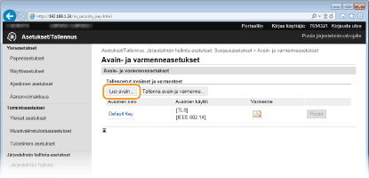 Avainparia ei voi poistaa, jos se on käytössä, esimerkiksi kun ”TLS” tai ”IEEE 802.1X” näytetään kohdassa [Avaimen käyttö]. Poista tässä tapauksessa toiminto käytöstä tai vaihda avainpari ennen sen poistamista.